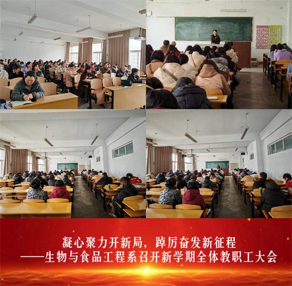 征程万里风正劲,奋楫扬帆再出发。为全面做好新学期教育教学工作,确保系部各项工作开好局、起好步。2月28日,生物与食品工程系在弘毅楼301教室召开全体教职工大会,部署新学期各项重点工作,领导班子成员及全体教职工参会,会议由党总支书记于艳琴主持。