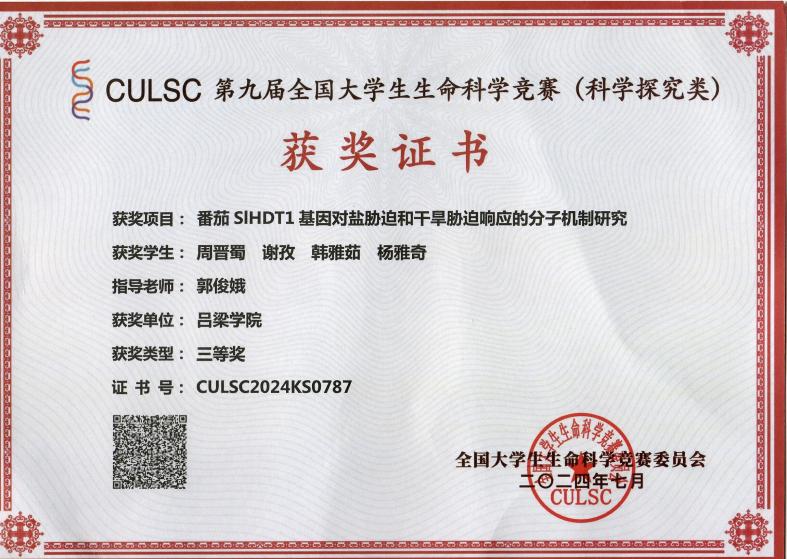 其中,项目:“番茄SIHDT1基因对盐胁迫和干旱迫响应的分子机制研究”(指导教师郭俊娥;学生周晋蜀、谢孜、韩雅茹、杨雅奇)荣获科学探究类全国三等奖。