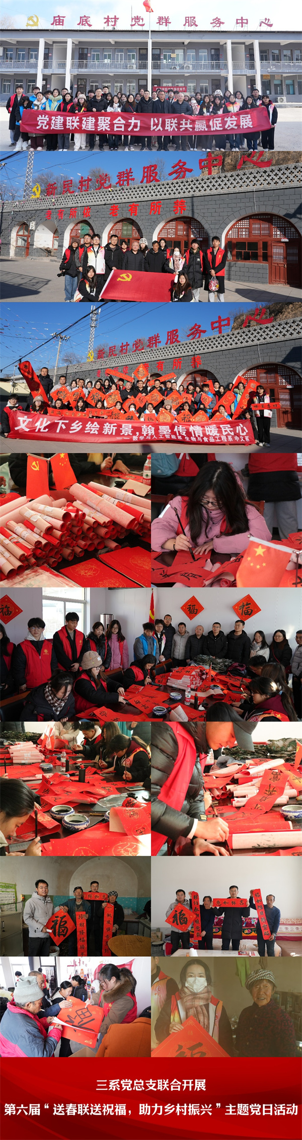 为进一步学习贯彻党的二十届三中全会精神,汇聚文化力量,弘扬传统文化,助力乡村振兴提质增效,让文化惠民政策深入基层,让更多乡村群众享受文化福利,12月7日,生物与食品工程系、数学与人工智能系和中文系负责人与吕梁学院派驻方山县北武当镇庙底村、新民村工作队联合开展第六届“送春联送祝福,助力乡村振兴”主题党日活动。吕梁学院驻庙底村、新民村工作队队员、村支两委班子成员以及各系学生党支部书记、学生党员、入党积极分子以及书法社成员等50余人参加了此次活动。