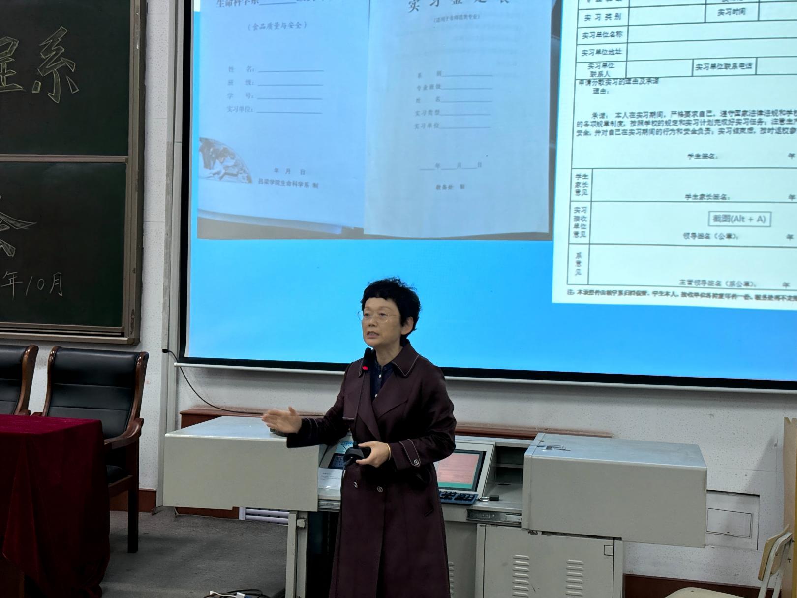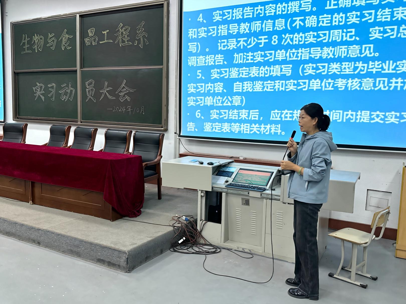 为助力2025届毕业生更好地开启毕业实习之旅,强化同学们对实习工作的认知与重视,确保实习工作有序推进,2024年10月16日,生物与食品工程系于道德讲堂组织召开食安、食科专业2025届毕业实习动员大会。系主任冯彩平、副主任王莉、辅导员苗艳艳、专业负责人王瑞参加本次会议。会议由苗艳艳主持。