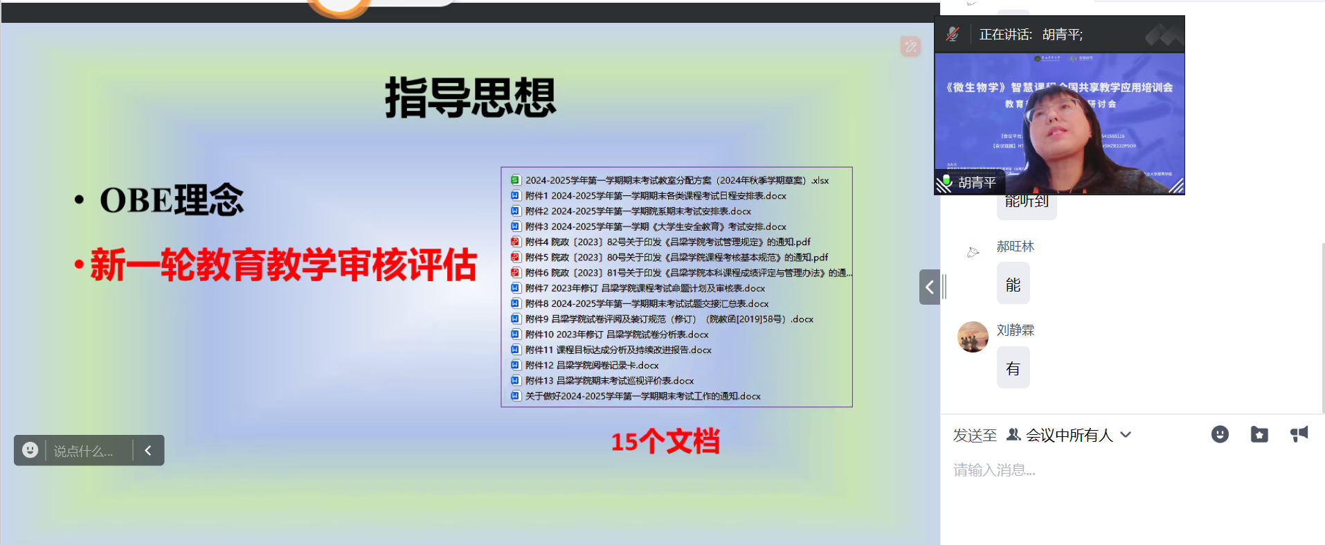 胡教授指出,课程考核的指导思想是OBE理念,落实产出导向,试题中必须有能够体现应用型特征、考核学生应用能力的题目,同时要满足新一轮教育教学审核评估的要求。胡教授对院教函〔2024〕67号文件进行详细解读,指出教师出题时容易忽略的问题;强调课程大纲中知识目标、能力目标和素质目标考核的方法与注意事项;解答了命题审核表中考核目标层级如何区分和选择。