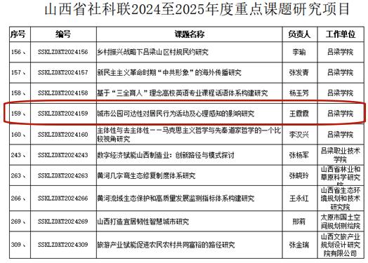 近日,山西省社科联正式公布了2024至2025年度重点课题资助名单,我系申报的项目《城市公园可达性对居民行为活动及心理感知的影响研究》经过严格评审,成功获得资助。这一成果不仅展示了我系科研团队在城乡生态环境与居民健康领域的研究实力,也为我系学科建设和发展增添了新的亮点。