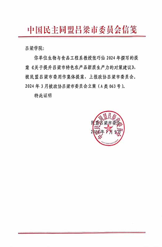 据悉,政协吕梁市委员会历来重视各界人士的建言献策,近年来立案的提案涉及经济、政治、文化、社会和生态文明建设等多个领域。此次张巧仙教授的提案成功立案,不仅展示了生物与食品工程系在科学研究和社会服务方面的实力,也为吕梁市的发展提供了有益借鉴。