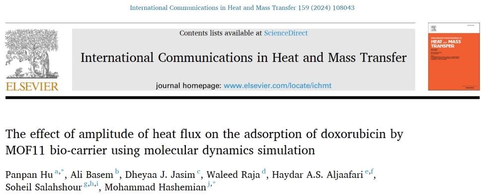近日,我系胡盼盼博士在药物毒理学方面取得了新的进展,研究成果以“Effect of amplitude of heat flux on the adsorption of doxorubicin by MOF11 bio-carrier using molecular dynamics simulation”为题发表于国际工程技术领域权威期刊《International communications in heat and mass transfer》(中国科学院分区二区Top期刊,影响因子:6.4)。
