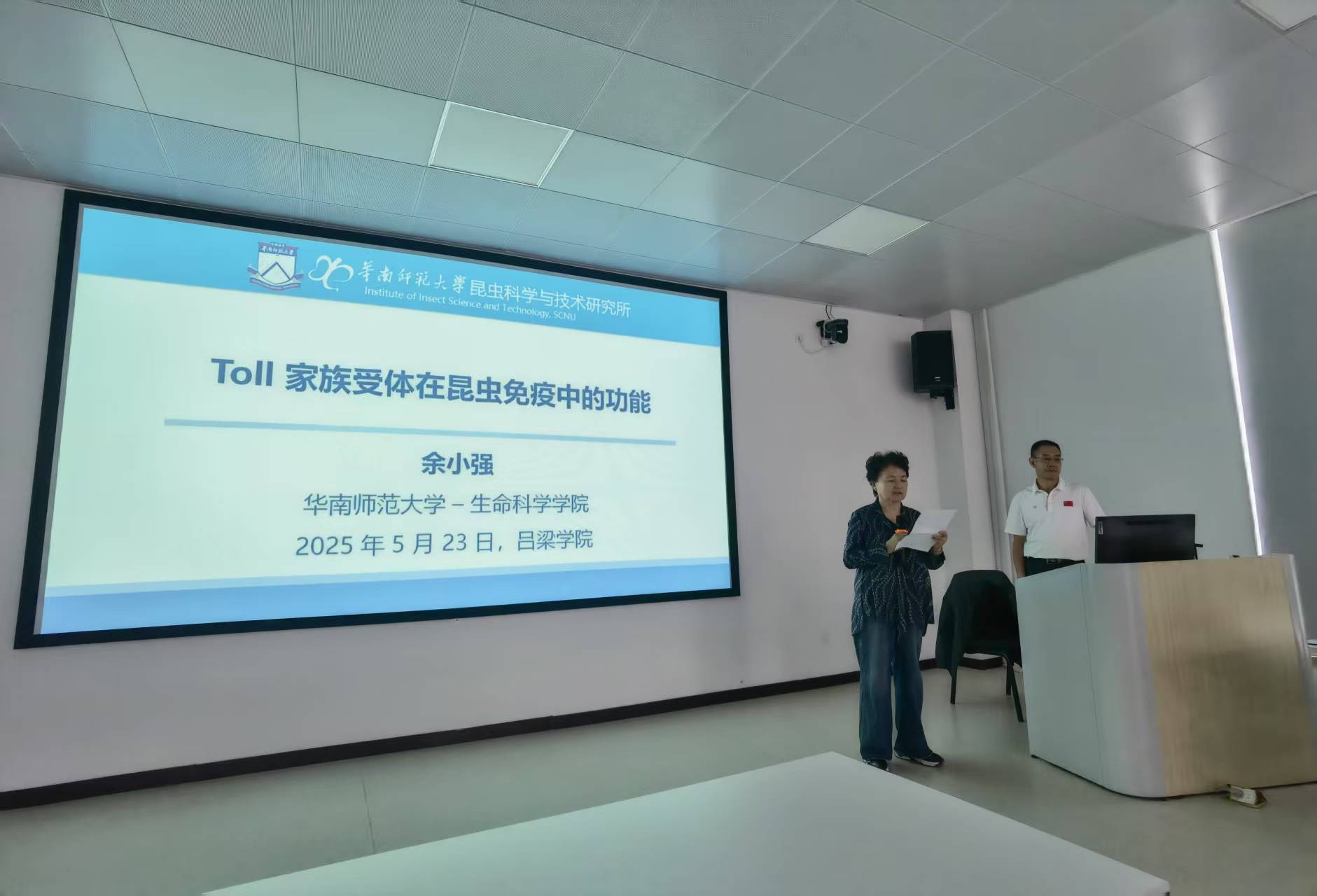 余小强教授,主要从事昆虫免疫与发育研究,尤其在模式识别受体、抗菌肽基因表达调控及免疫信号传导途径等研究中取得一些关键的发现。此次讲座主题为“Toll家族受体在昆虫免疫中的功能”。余小强教授结合实验室30多年来在昆虫先天免疫中的研究成果,首先介绍昆虫模式识别受体,尤其是C-型凝集素在细胞免疫和体液免疫中的功能以及免疫蛋白在苏云金芽孢杆菌杀虫中的作用。随后围绕Toll/Toll样受体(TLR),介绍昆虫Toll和哺乳动物TLR受体的结构异同及其在先天免疫中的功能,并重点介绍实验室新发现的Toll-ML信号通路在抵抗细菌和昆虫杆状病毒中的功能。研究成果为动物Toll/TLR的共同起源学说提供有力证据,对动物先天性免疫信号传导途径的进化和基因表达调控具有重要意义。余教授在科研工作上持之以恒的钻研精神给师生留下了深刻印象。