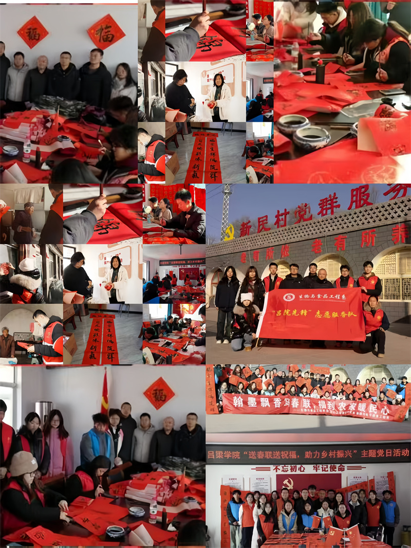 乡村振兴一线,积极响应学校服务地方发展号召,开展第七届“送春联送祝福,助力乡村振兴”主题党日活动,2025 年11月10日组织 “春联下乡,剪纸寄情,笔墨传暖韵,青春践初心”活动,12月9日走进方山县北武当镇庙底村、新民村,12月16日再赴乡村社区开展 “笔墨送福暖乡村 新春联语传温情”活动,以专业所长赋能乡村文化发展,践行学校服务地方的办学定位。