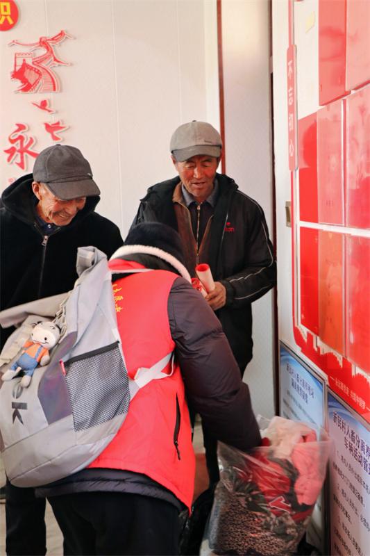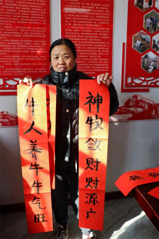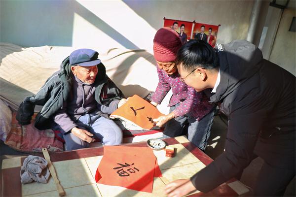 活动现场,大红春联翰墨飘香,暖暖情意溢满人心。学生和老师们挥毫泼墨、奋笔疾书,他们对群众的要求有求必应,以“干部合力齐施精准帮扶策、民众同心共创祥和开泰年”,“帮扶送暖不忘初心、乡村振兴牢记使命”,“牛人养牛牛气旺、神犊敛财财源广”,“小牛天天增体重、大牛年年生小犊”,“牛壮猪肥六畜旺、粮丰林茂四时兴”,“迎新春万事如意、纳鸿福全家安康”等内容的春联,赞美中国共产党成立百年以来全面建成小康社会的辉煌成就;一副副笔法精湛、遒劲有力的春联和福字书写着浓浓的年味和深深的祝福。村民们络绎不绝,个个笑逐颜开,挑选着自己心仪的春联,洋溢着一派其乐融融的节日气氛。同时志愿者在驻村工作队员带领下为独居老人、行动不便老人和孤寡老人们上门送上新春对联,将慰问、祝福、喜庆送到家。