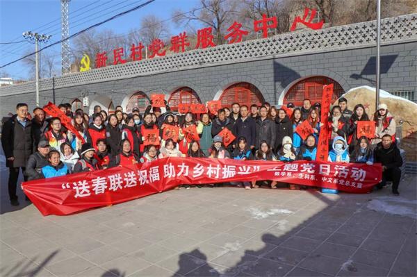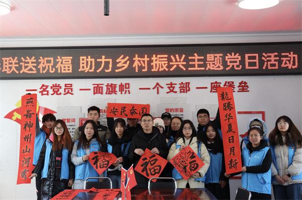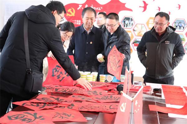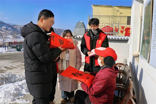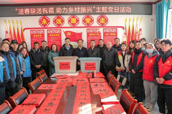 为进一步学习贯彻习近平新时代中国特色社会主义思想主题教育,汇聚文化力量,助力乡村振兴提质增效,让文化惠民政策深入基层,弘扬传统文化,让更多乡村群众享受文化福利,12月23日,吕梁学院党委常委、副院长王三虎带领生物与食品工程系与数学与人工智能系、中文系党总支与吕梁学院派驻方山县北武当镇庙底村、新民村工作队联合开展“送春联送祝福,助力乡村振兴”主题党日活动。吕梁学院驻庙底村、新民村工作队队员、村支两委班子成员以及各系教工党员、学生党支部书记、学生党员、入党积极分子以及书法社成员等50余人参加了此次活动。
