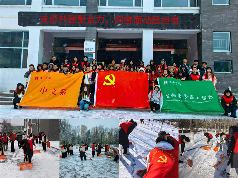 温骤降,白雪如霜,大雪在点缀校园的同时,也给师生们的出行带来了隐患。为确保师生的出行安全,保证校园环境整洁。12月14日,生物与食品工程系与中文系开展支部共建“冬日除雪”活动