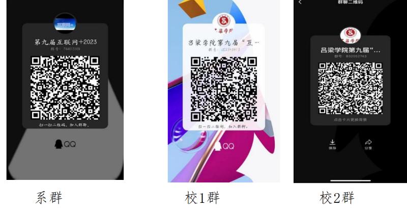 具体信息查看:吕梁学院第九届“互联网+”大学生创新创业大赛实施方案 -教务处 https://jwc.llu.edu.cn/info/1875/8185.htm 注意事项: ①我系申报的项目作品提交日期截止时间为6月5日中午12:00。各班班长需在截止日期前将汇总好的电子版材料(项目计划书、 报名汇总表)发到邮箱974977848@qq.com ③有意参加的同学请加群(左面为系群,右面为校群。两群都要 加。校1群满后,加2群)