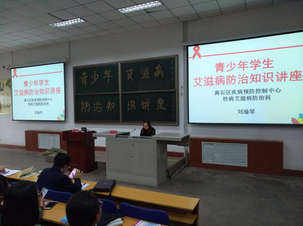 刘瑜琴科长向现场同学介绍了艾滋病的病理、流行形势、疫情现况、传播途径、预防措施等艾滋病的相关知识以及对待艾滋病患者的正确态度。刘瑜琴科长的讲授内容贴近同学们的生活实际,获得了同学们的一致认可,最后,讲座在同学们热烈的掌声中结束。