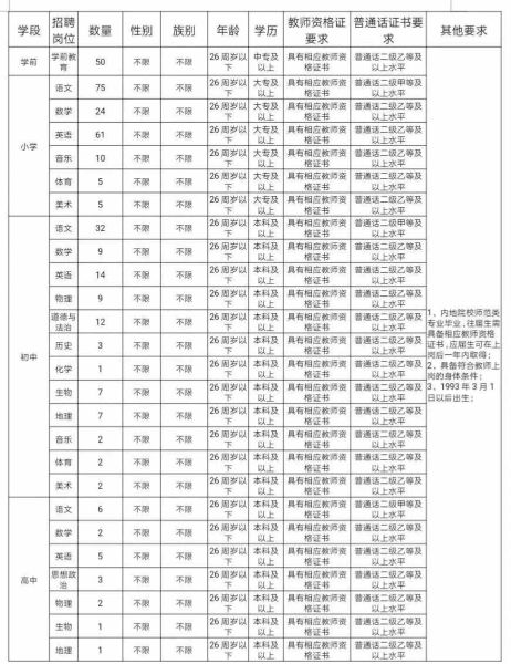 (3)初中、高中岗位:具备全日制本科及以上学历,师范类专业。