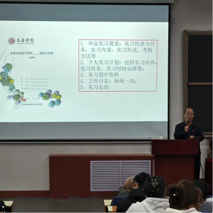 随后,张瑞刚副主任就毕业实习工作作出详细部署,从日常出勤管理到岗位行为规范逐一说明,要求同学们严格遵守纪律,以严谨的态度投入实习,充分展现生物与食品工程系学子的良好素养与精神风貌。